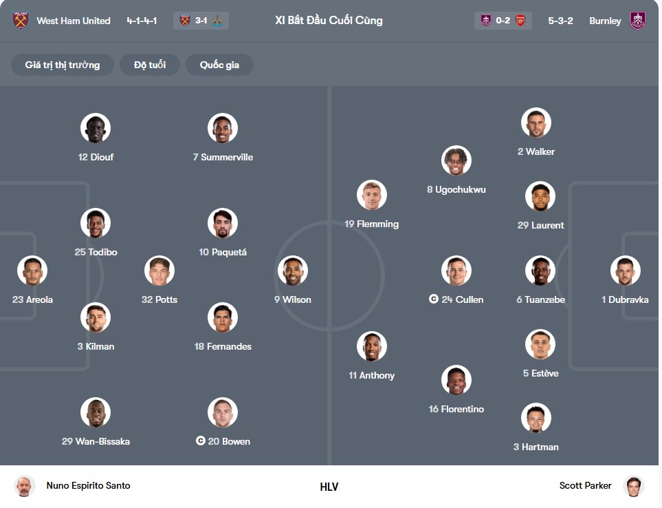 Trong trận đấu ấy, Lucas Paqueta đã gỡ hòa bằng một pha xử lý đẳng cấp sau khi đội khách sớm vươn lên dẫn trước, tiếp đó Sven Botman đá phản lưới giúp “Búa tạ” vượt lên. Và đến những phút bù giờ cuối cùng, Tomas Soucek tung cú dứt điểm quyết đoán, ấn định chiến thắng đầy cảm xúc một chiến thắng đến đúng lúc, giúp West Ham có được niềm tin cần thiết để tiếp tục cuộc chiến trụ hạng khốc liệt. Chiến thắng ấy còn mang ý nghĩa lớn hơn khi nó là lần đầu tiên West Ham giành trọn 3 điểm trên sân nhà sau gần 9 tháng. Trên khán đài, dù người hâm mộ vẫn bày tỏ sự bất mãn với ban lãnh đạo, nhưng HLV Nuno không thể che giấu niềm vui trong ngày giành thắng lợi đầu tay cùng đội bóng mới. Với 3 điểm quý giá này, West Ham đã vươn lên vị trí thứ 18, chỉ còn kém nhóm an toàn do chính Burnley nắm giữ 3 điểm, biến cuộc đối đầu sắp tới trở thành trận cầu 6 điểm thực sự.
