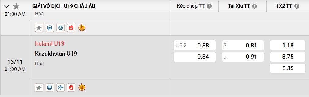 Tỷ lệ kèo U19 Ireland vs U19 Kazakhstan