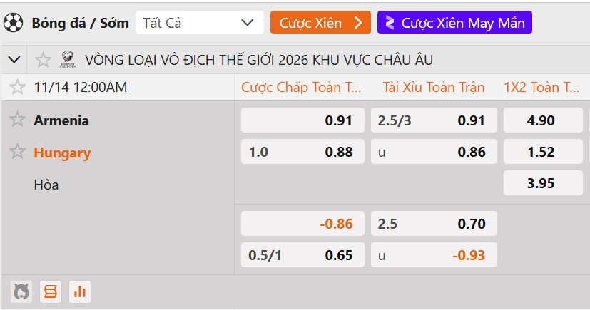 Tỷ lệ kèo Armenia vs Hungary