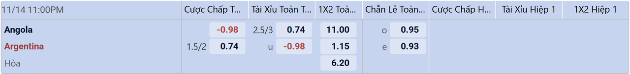 Vì ở khác khu vực, Angola vs Argentina mới có 1 lần gặp nhau trong quá khứ vào năm 2006 và đại diện Nam Mỹ hạ gục đội tuyển đến từ châu Phi với tỷ số 2-0. Sau gần 2 thập kỷ, vị thế của hai bên không hề hoán đổi, nên thầy trò Lionel Scaloni nhận được nhiều sự ưu ái của nhà cái, tỷ lệ chấp 1.75 bàn trước giờ bóng lăn chính là ví dụ điển hình. Mặc dù các vũ công Tango sẽ không tung ra toàn bộ sức mạnh, nhưng khả năng thắng kèo khi đặt niềm tin vào nhà ĐKVĐ vẫn tốt hơn là tin tưởng và một Angola yếu đuối không có sức phản kháng.