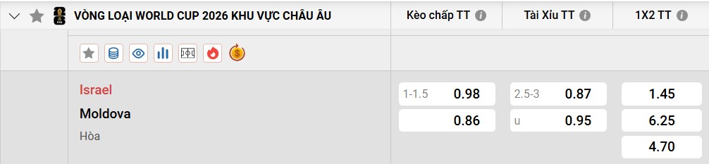 Ở phía ngược lại, Moldova ghi bàn ở 3 trong 5 trận gần nhất nhưng trung bình mỗi trận chỉ ghi được chưa đầy một bàn. Hàng thủ của họ vẫn là vấn đề lớn khi để thủng lưới cả năm trận, với tổng cộng 20 bàn thua, trung bình bốn bàn mỗi trận. Tất cả 5 cuộc đối đầu gần nhất giữa hai đội đều có từ 3 bàn thắng trở lên và xu hướng này nhiều khả năng sẽ tiếp tục xuất hiện trong trận đấu sắp tới, nơi cả hai đội có thể cùng ghi bàn nhưng Israel vẫn được đánh giá cao hơn để giành chiến thắng. Chọn cửa trên của Israel với mức kèo được niêm yết ở mốc sẽ chấp đối thủ khá sâu lên tới 1 1/4 trái và tài 2 3/4 trái cho kèo châu Á.