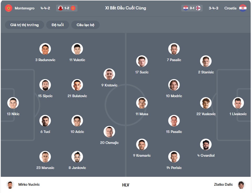 Montenegro tiếp Croatia ở lượt cuối vòng loại World Cup 2026. Chủ nhà đã bị loại, trong khi Croatia vượt trội hoàn toàn và nhiều khả năng sẽ khép lại chiến dịch bằng một chiến thắng thuyết phục.