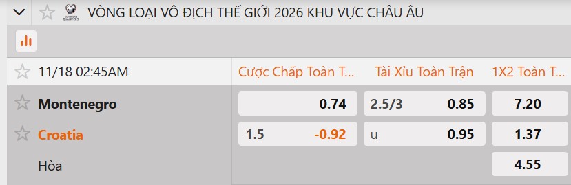 Tổng thể, Croatia khi thi đấu sân khách có hàng công khá mạnh, có thể bùng nổ khi gặp đối thủ yếu nhưng lại thiếu ổn định khi đối đầu các đội hàng đầu, dẫn đến những trận thua đậm hoặc không ghi nổi bàn thắng trong một số trận nhất định. Hàng thủ chắc chắn chính là một trong những lợi thế lớn nhất của Croatia ở thời điểm này. Trong khi đó, dù Montenegro vừa có 2 chiến thắng gần đây trước những đối thủ bị đánh giá thấp hơn nhưng hàng công của họ vẫn thể hiện sự thiếu hiệu quả và gặp quá nhiều khó khăn khi đối mặt với những đội bóng mạnh. Vì vậy, rất nhiều khả năng Montenegro sẽ không thể xuyên thủng được hệ thống phòng ngự của Croatia trong trận đấu này, đặc biệt khi đội khách đang đạt phong độ cao và giữ sự tập trung tối đa dù đã sớm giành vé đi tiếp. Chọn cửa trên của Croatia với mức kèo chấp được niêm yết ở mốc sẽ chấp đối thủ khá sâu lên tới 1 1/2 trái và xỉu 2 3/4 trái cho kèo châu Á.