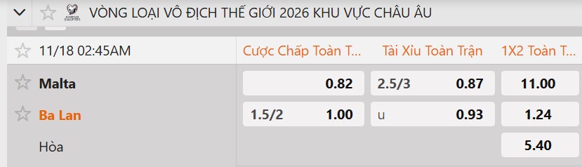 Tuy nhiên, việc thi đấu trên sân khách khiến Ba Lan khó có thể áp đặt thế trận một cách hoàn toàn “lộng hành”, dù cho họ đang có phong độ khá ổn định với chuỗi 5 trận bất bại, trong đó có 3 chiến thắng và 2 trận hòa. Nhiều khả năng Ba Lan sẽ tái hiện thắng lợi 2-0 trước Malta giống như trận lượt đi, bởi lối chơi của họ vẫn duy trì được sự chắc chắn cần thiết trong những trận đấu gặp đối thủ yếu hơn. Xu hướng thi đấu gần đây của Malta cho thấy trong 4/5 trận của họ đều chỉ xuất hiện tối đa 1 bàn thắng trong hiệp 1, và điều tương tự cũng xảy ra ở 10/11 trận gần đây của Ba Lan. Thống kê toàn trận cũng cho thấy 10/12 trận chính thức gần nhất của Malta chỉ có tối đa 3 bàn thắng và trong 9/10 trận của Ba Lan cũng lặp lại xu hướng như vậy. Từ những cơ sở đó, có thể dự đoán Ba Lan sẽ giành chiến thắng với cách biệt trên một bàn trong một trận đấu được dự báo là khan hiếm bàn thắng. Chọn cửa trên của Ba Lan với mức kèo chấp được niêm yết ở mốc sẽ chấp đối thủ khá sâu lên tới 1 3/4 trái và xỉu 2 3/4 trái cho kèo châu Á.