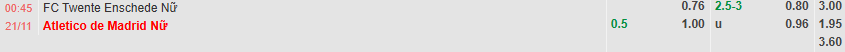 Phong độ trong giai đoạn vừa qua của Nữ FC Twente Enschede là không thực sự tốt khi đội bóng này mang về cho mình 2 trận thắng, 2 trận hoà và 1 trận thua. Trong khi đó, Nữ Atletico de Madrid đã thể hiện chấp nhận được khi nắm giữ trong tay 3 thắng lợi ở 5 trận đấu gần nhất trên mọi đấu trường, còn lại là việc đội bóng này có 1 trận hoà và đã phải nhận 1 thất bại. Về cơ bản thì Nữ Atletico de Madrid là đội bóng được đánh giá cao hơn về mặt đẳng cấp trận này. Với tỷ lệ cá cược 0,5 trái thì các nhà đầu tư nên tin tưởng vào Nữ Atletico de Madrid ở cuộc đối đầu này để mang về cơ hội thắng kèo cao hơn.