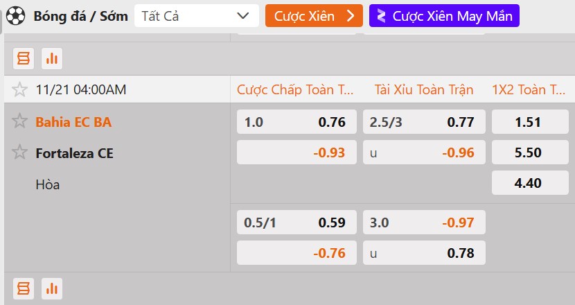 Tỷ lệ kèo Esporte Clube Bahia vs Fortaleza Esporte Clube