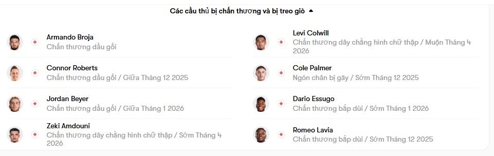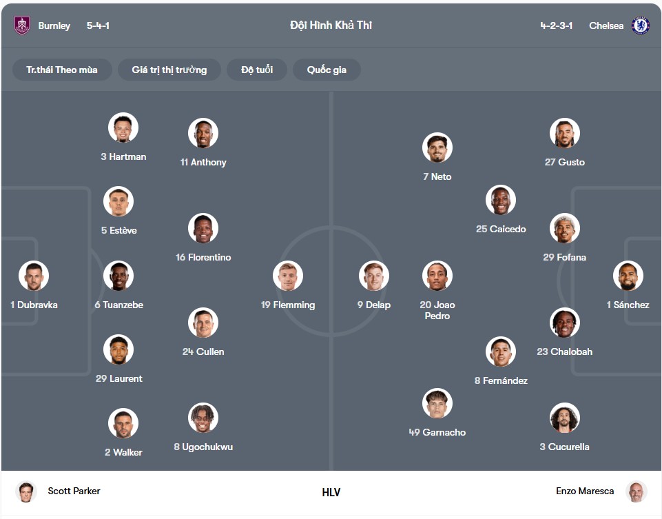 Burnley có tin vui khi chấn thương mắt cá chân của Armando Broja không quá nghiêm trọng, tuy nhiên tiền đạo này gần như chắc chắn vắng mặt trong cuộc tái ngộ với Chelsea. Ngoài ra, Burnley cũng không thể có sự phục vụ của Jordan Beyer, Zeki Amdouni và Connor Roberts. Trong khi đó, Lesley Ugochukwu lại sẵn sàng ra sân và có thể sẽ được bố trí thi đấu phía sau Zian Flemming, người đang có phong độ tốt với 3 bàn thắng sau 4 trận tại Premier League cho Burnley. Ở chiều ngược lại, Chelsea lại đang thể hiện phong độ đi lên rõ rệt. Họ thắng Wolves 3-0, đánh bại Tottenham ngay trên sân khách, và khi tính trên chín trận gần nhất trên mọi đấu trường thì Chelsea thắng đến 7 trận. Sự cải thiện rõ nhất đến từ hàng phòng ngự, nơi họ giữ sạch lưới hai trận liên tiếp và hạn chế đối thủ tạo ra cơ hội nguy hiểm. Điển hình là trận thắng Tottenham, nơi Chelsea chỉ để đối thủ tạo ra con số bàn thắng kỳ vọng 0,05 mức thấp nhất lịch sử Premier League từ trước đến nay. Bộ đôi Chalobah – Fofana trở thành điểm tựa đáng tin cậy, trong khi Caicedo tiếp tục chứng minh đẳng cấp của một trong những tiền vệ phòng ngự xuất sắc nhất thế giới.