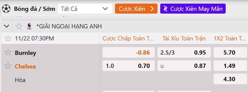 Tỷ lệ kèo Burnley vs Chelsea