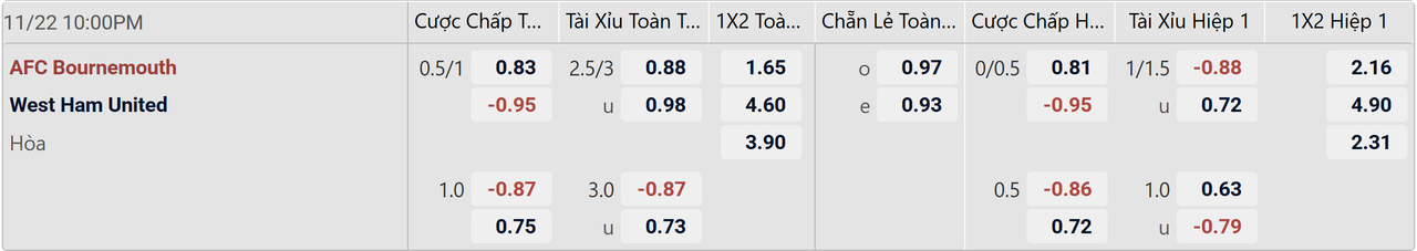 Hàng công của thầy trò Nuno Espirito Santo đang chơi tốt với cả 2 chiến thắng gần nhất đều nổ súng 3 lần. Bên cạnh đó, sự yếu kém nơi tuyến phòng ngự chính đã khiến West Ham trải qua quãng thời gian tăm tối ở dưới đáy bảng xếp hạng với cả 3 thất bại gần nhất luôn thủng lưới tối thiểu 2 bàn. Cộng với 7 bàn thua của Bournemouth trong cả 2 lần ra sân tại tháng 11 này, nhiều khả năng cuộc đọ sức giữa thầy trò Andoni Iraola với The Hammers sẽ có nhiều pha lập công. Mức kèo tài xỉu 2.75 FT cực kỳ phù hợp để chọn tài, người chơi không nên bỏ lỡ cơ hội thu về lợi nhuận ở màn trình diễn trên sân vận động Vitality vào cuối tuần này.