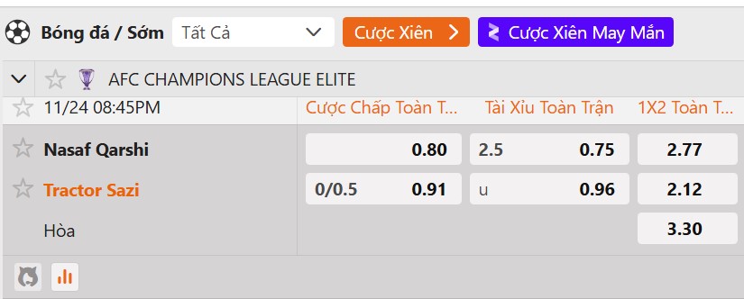 Dựa trên phong độ hiện tại cũng như những gì hai đội đã trình diễn từ đầu giải, không khó hiểu khi Tractor S.C được đánh giá cửa trên ở trận đấu này. Nhà cái châu Á đưa ra tỷ lệ chấp 1/4 trái nghiêng về phía đội khách, cho thấy niềm tin khá rõ ràng dành cho đại diện Iran. Dù Nasaf Qarshi từng toàn thắng cả hai lần đối đầu trong quá khứ, những trận đấu ấy đã diễn ra từ hơn một thập kỷ trước và không còn mang nhiều ý nghĩa khi so sánh với tình thế hiện tại. Trong bối cảnh Nasaf Qarshi sa sút nghiêm trọng trên mọi phương diện còn Tractor S.C lại thể hiện sự vượt trội về chất lượng đội hình lẫn hiệu quả thi đấu, khả năng đội khách giành trọn 3 điểm trong màn tái đấu sắp tới được xem là rất cao.
