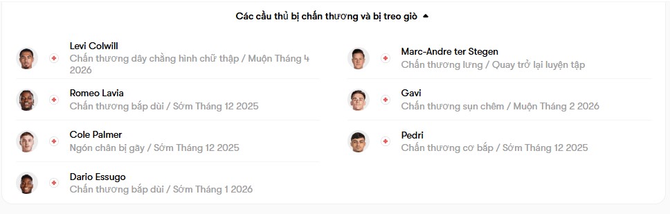 Phía Barca cũng gặp tình trạng nhân sự phức tạp. Alejandro Balde dính chấn thương đầu trong trận gặp Bilbao nhưng không nghiêm trọng và nhiều khả năng vẫn ra sân ở Stamford Bridge. Marcus Rashford tân binh đến từ Man United – vẫn chưa đạt trạng thái thể lực tối ưu và bỏ ngỏ khả năng thi đấu. Trong khi đó, Raphinha đã trở lại sau chấn thương gân kheo và vào sân từ ghế dự bị trong trận đấu cuối tuần. Ferran Torres đang thể hiện phong độ tốt với cú đúp vào lưới Bilbao và chắc chắn muốn giữ chặt vị trí của mình. Ngoài ra, Frenkie de Jong sẽ trở lại sau án treo giò ở La Liga, còn Pedri, Gavi và thủ môn Ter Stegen tiếp tục vắng mặt.