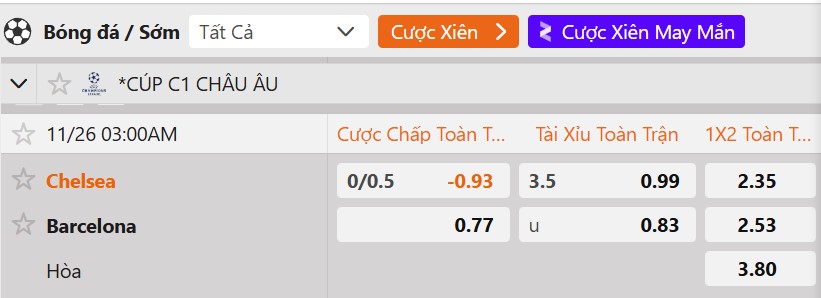 Tỷ lệ kèo Chelsea vs Barcelona