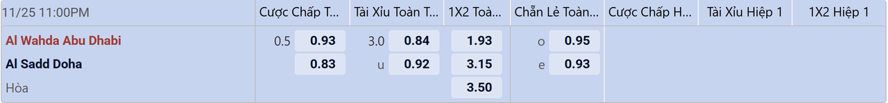 Al Wahda bước tới cuộc đối đầu Al-Sadd với vị thế của đội cửa trên chấp 0.5 FT và nắm giữ ưu thế địa lợi. Tuy nhiên, chính điều này đã khiến Al-Sadd trở nên giá trị hơn câu lạc bộ đang đứng thứ 3 tại BXH miền Tây của cúp C1 châu Á. Thống kê cả 6 trận đối đầu giữa Al Wahda vs Al-Sadd trước đây cho thấy, khả năng vượt ải handicap của đội khách vượt trội hơn hẳn với kịch bản chỉ hoà. Thêm vào đó là thành tích 2/5 thắng gần đây của Al Wahda và chuỗi 3 trận bất bại liên tiếp đến từ thầy trò Sergio Alegre. Cửa dưới mà là phương án đầu tư hoàn hảo dù cho vị thế của hai câu lạc bộ có nhiều sự cách biệt.