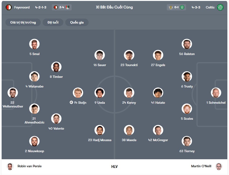 Về phía Celtic, phong độ của đại diện Scotland nhìn chung ổn hơn Feyenoord. Trong 12 trận gần nhất theo thống kê các kết quả thi đấu trong những lần ra sân đã qua, Celtic giành được khá nhiều chiến thắng quan trọng. Họ thắng St. Mirren 1-0, thắng Kilmarnock 4-0, thắng Falkirk 4-0, thắng Sturm Graz 2-1, thắng Motherwell 3-2 và thắng Dundee FC 2-1. Những trận thắng này cho thấy Celtic duy trì khả năng tấn công ấn tượng và ổn định hơn. Dù vậy, họ vẫn có những cú vấp đáng chú ý khi để thua Midtjylland 1-3, thua Hearts 1-3 và thua Braga 0-2. Điều này phản ánh rằng mỗi khi đối đầu với các đội bóng có tổ chức chiến thuật tốt, Celtic dễ rơi vào thế bế tắc và bị khai thác điểm yếu về tốc độ phòng ngự.
