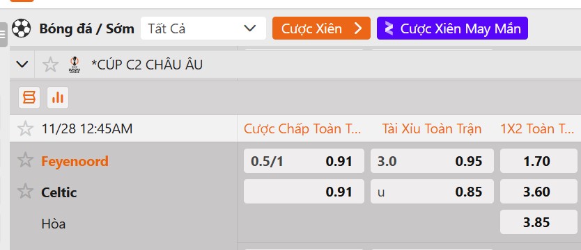 Tỷ lệ kèo Feyenoord Rotterdam vs Celtic