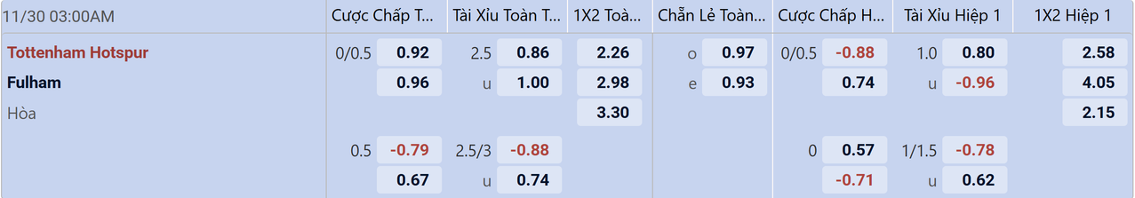 Phong độ ảm đạm của Tottenham là nguyên nhân chính khiến họ không được đánh giá cao trước thềm tiếp đón Fulham, trên sân nhà Tottenham thậm chí đã không giành bất kỳ chiến thắng nào trong 5 trận gần nhất thi đấu tại đây trong khuôn khổ Premier League, trong đó có 2 trận hòa và 3 trận thua. Trong khi đó, Fulham dù có kết quả cũng không hề sáng sủa khi thi đấu trên sân khách nhưng họ bất bại ở cả 3 lần gần nhất đối đầu Tottenham trong đó có 2 chiến thắng với 1 trận hòa, thành tích này khiến người hâm mộ tin tưởng đội khách có thể sẽ giành được chiến thắng ở sân chơi handicap. Nhà cái không đánh giá cao khả năng làm bàn của hai đội khi đưa ra kèo tổng bàn thắng chỉ ở mức 2.5 FT và điều này hoàn toàn có cơ sở khi 3/4 lần đối đầu gần nhất của họ khép lại khi không có nhiều hơn 2 bàn xuất hiện.