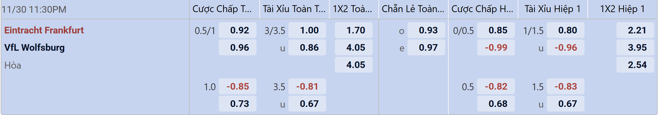 Phong độ của Frankfurt chưa phải hoàn hảo nhưng sức mạnh hiện tại đủ để khiến Wolfsburg chìm sâu vào cơn khủng hoảng và đẩy Sói Xanh gần hơn tới kịch bản xuống hạng. Đại Bàng Đỏ bước đến vòng 12, Bundesliga với tỷ lệ cá cược chấp 0.75 FT và rõ ràng cửa trên là sự lựa chọn hoàn hảo. Wolfsburg quá yếu để có thể gây bất ngờ trước chủ sân Deutsche Bank Park. Họ đã thua kèo châu Á 4 trận liên tiếp và cũng chỉ hạ gục Frankfurt 1 lần duy nhất trong 5 cuộc đụng độ gần đây từ 2023 đến nay. Nhìn vào thành tích 2/11 lần ca khúc khải hoàn mùa này của thầy trò Daniel Bauer ở Bundesliga 2025/26, Wolfsburg thực sự trở nên vô vọng.
