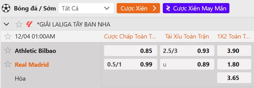 Tỷ lệ kèo Athletic Bilbao vs Real Madrid