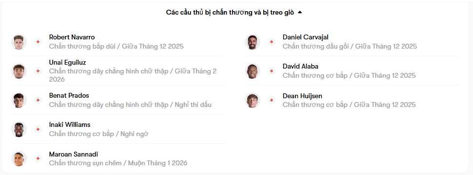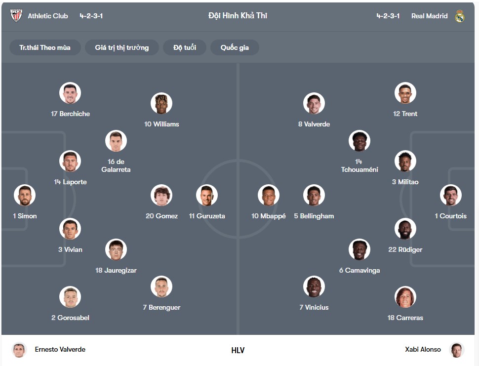 Real Madrid cũng gặp nhiều vấn đề về lực lượng. Dani Carvajal tiếp tục ngồi ngoài vì chấn thương đầu gối. Bộ ba Dean Huijsen, David Alaba và Raul Asencio đều cần được kiểm tra thêm trước giờ bóng lăn. Dù vậy, sự trở lại của Eder Militao và Antonio Rudiger nơi trung tâm hàng phòng ngự sau chấn thương là tín hiệu đáng mừng. Alvaro Carreras nhiều khả năng sẽ tiếp tục đá hậu vệ trái, còn Eduardo Camavinga có thể được Xabi Alonso bố trí thay Arda Guler để củng cố sự chắc chắn ở tuyến giữa. Jude Bellingham hứa hẹn sẽ tiếp tục đóng vai trò hộ công phía sau bộ đôi Vinicius Junior – Mbappe, tạo nên tam tấu tấn công rất đáng chờ đợi.