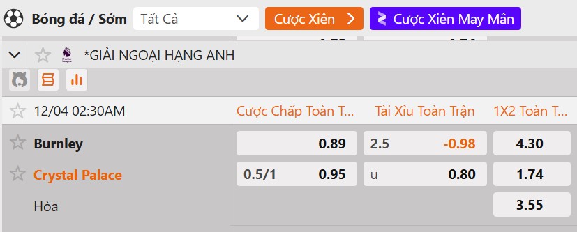 Tỷ lệ kèo Burnley vs Crystal Palace