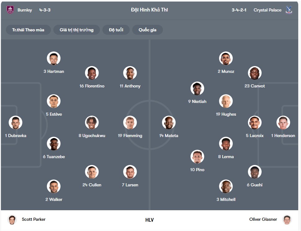 Ngay cả khi Burnley được chơi tại Turf Moor, niềm tin dành cho họ vẫn rất thấp bởi họ chỉ thắng một trận trong sáu lần gần nhất chơi trên sân nhà. Trái ngược với điều này, Crystal Palace thắng hai trong ba trận sân khách gần nhất và đồng thời bất bại trước Burnley ở bốn cuộc đối đầu gần nhất với hai chiến thắng và hai trận hòa. Những con số ấy cho thấy Palace đang sở hữu nhiều lợi thế hơn về mọi mặt. Không chỉ phong độ, Crystal Palace còn đối mặt với tổn thất nhân sự khi Cheikh Doucoure, Chadi Riad, Caleb Kporha và Borna Sosa đều vắng mặt do chấn thương. Burnley cũng gặp tình trạng tương tự khi thiếu Zeki Amdouni, Connor Roberts và Jordan Beyer. Dù vậy, khả năng đôi bên ghi bàn là khá cao khi Burnley đã nổ súng trong 3 trong 5 trận gần nhất, còn Crystal Palace cũng làm được điều đó 4 trong 5 trận vừa qua. Burnley ghi bàn đều đặn ở bốn trong năm trận sân nhà gần đây, trong khi Palace cũng duy trì hiệu suất ghi bàn tốt trên sân khách.