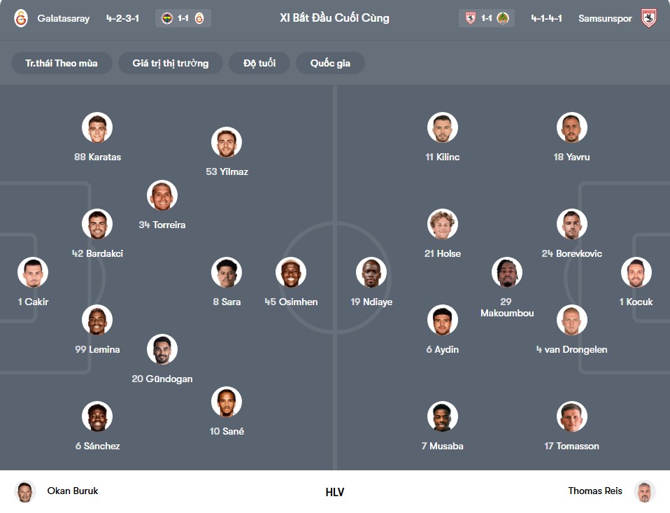 Số trận Samsunspor thua đậm trong chuỗi trận gần đây gần như không đáng kể. Họ không cho thấy dấu hiệu dễ bị đối thủ áp đảo hoàn toàn. Thậm chí, họ thường xuyên tạo ra sự khó chịu, đặc biệt khi chơi trên sân khách, như trận hòa trước Besiktas hay hòa Breidablik. Điều đó cho thấy Samsunspor đang dần trở thành một tập thể thi đấu kỷ luật và có khả năng đứng vững trước áp lực lớn. Nhìn lại lịch sử đối đầu giữa hai đội, Galatasaray hoàn toàn áp đảo Samsunspor trong nhiều năm qua. Dựa trên hình ảnh bạn cung cấp, trong lần gặp gần nhất, Galatasaray thắng 2-0 vào ngày 12/04/2025. Trước đó nữa ở trận đấu tháng 11/2024, Galatasaray thắng Samsunspor 3-2. Xa hơn nữa, ngày 03/02/2024, Galatasaray tiếp tục thắng 2-0. Giai đoạn 2023 cũng ghi nhận trận thắng 4-2 của Galatasaray trước Samsunspor.
