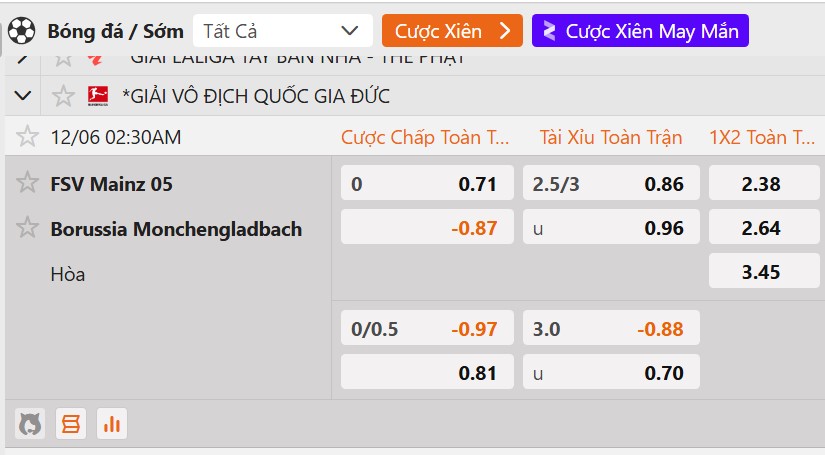 Tỷ lệ kèo Mainz 05 vs Monchengladbach