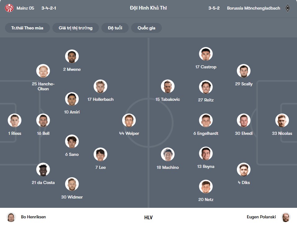 Về lực lượng, Mainz thiếu nhiều trụ cột như Dominik Kohr và Paul Nebel do án treo giò, còn Anthony Caci, Robin Zentner và Maxim Dal gặp chấn thương. Gladbach cũng không có được đội hình mạnh nhất khi Fabio Chiarodia, Jonas Omlin, Philipp Sander và Robin Hack đều vắng mặt vì chấn thương. Tình hình này có thể ảnh hưởng đến cách tiếp cận trận đấu của cả hai đội. Mainz thường thua kèo châu Á hiệp 1 khi thất bại ở 4/5 trận gần nhất trong 45 phút đầu, trong khi Gladbach lại rất mạnh trước giờ nghỉ với 6 trận thắng kèo, 1 trận hòa và chỉ 1 lần thua. Xu hướng ghi ít bàn cũng xảy ra thường xuyên bởi 3/4 trận gần đây của Mainz và 5/8 trận đối đầu gần nhất đều chỉ có tối đa 2 bàn, trong khi Gladbach giữ sạch lưới ở 3 trong 4 trận gần đây.