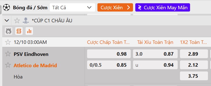 Tỷ lệ kèo PSV Eindhoven vs Atletico de Madrid