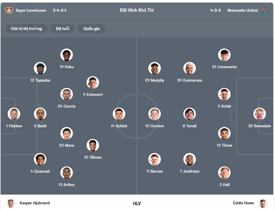 Xét về lực lượng, Bayer Leverkusen nhiều khả năng sẽ sắp xếp Jarell Quansah chơi cạnh Loic Bade và Jeanuel Belocian ở hàng phòng ngự. Sự vắng mặt của Exequiel Palacios do chấn thương háng buộc HLV Hjulmand phải cân nhắc Aleix Garcia cùng Ibrahim Maza cho vai trò tiền vệ trung tâm. Trên hàng công, Patrik Schick được kỳ vọng sẽ lĩnh xướng với sự hỗ trợ của Christian Kofane và Malik Tillman. Bên phía Newcastle, thủ môn Aaron Ramsdale có thể tiếp tục trấn giữ khung gỗ trong bối cảnh Nick Pope chưa kịp hồi phục. Phía trước anh, bộ đôi Fabian Schar và Malick Thiaw sẽ là chốt chặn quan trọng, còn tuyến giữa vẫn xoay quanh Bruno Guimaraes, người có thể được hỗ trợ bởi Sandro Tonali và Joelinton. Trên hàng công, Nick Woltemade được dự đoán sẽ chơi cao nhất, với Anthony Gordon và Anthony Elanga hoạt động ở hai cánh, trong khi tân binh Yoane Wissa có khả năng góp mặt từ ghế dự bị.