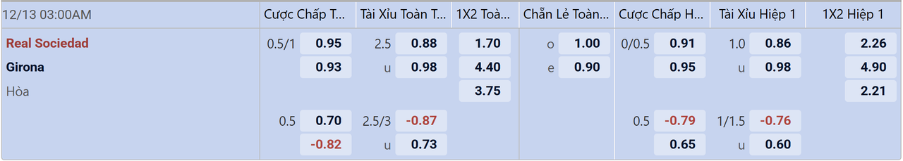 Đã 6 vòng đấu liên tiếp trôi qua, Girona vẫn chưa biết cách ghi bàn thắng thứ 2 trong thời gian chính thức. Tổng cộng, thầy trò Mitchel chỉ có 5 pha làm bàn trong 6 màn trình diễn kể trên và còn tịt ngòi ở lần ra quân gần nhất gặp Elche. Bên kia phần sân, Real Sociedad đã khép lại vòng 15, La Liga bằng kịch bản thua trận 1-0 trước Alaves. Hiệu suất ghi bàn của đội chủ sân Reale Arena gần đây bất ổn y chang phong độ, thế nên xỉu là lựa chọn sáng suốt dành cho người chơi.