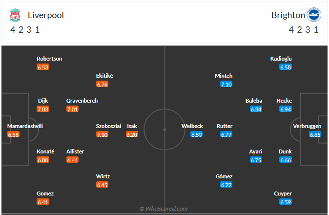 Vòng đấu trước là minh chứng rõ ràng nhất cho khả năng phòng ngự kém cỏi của Liverpool khi mà họ đã để cho Leeds United cầm hoà với tỉ số 3-3. Hơn nữa, HLV Arne Slot cũng đang cho thấy khả năng bố trí và thay đổi nhân sự trong trận đấu của mình chưa thực sự hợp lý. Vòng đấu này khi đối đầu với Brighton thì sẽ không dễ để Liverpool có thể sở hữu cho mình thắng lợi, nhất là ở bối cảnh bất ổn như hiện tại. HLV Arne Slot sẽ cần phải có phương án để giúp hàng phòng ngự có sự cải thiện nếu như muốn có được thắng lợi trận này.