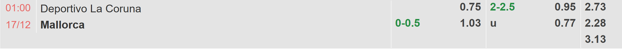 Hàng công của Deportivo trong thời gian qua sa sút phong độ đáng kể, họ chỉ nổ súng 1 lần duy nhất trong 2 thất bại liên tiếp. Dù đã ghi tới 7 bàn trước khi đụng độ Mallorca ở vòng 1/16, cúp nhà vua Tây Ban Nha, nhưng 2 đối thủ của thầy trò Antonio Hidalgo từng chạm trán quá yếu, khác hoàn toàn với sức mạnh mà Mallorca sở hữu. Giới chuyên môn khuyên người chơi chọn xỉu bàn thắng vì hai đội hiểu rõ thực lực đôi bên và tính quan trọng của trận đấu loại trực tiếp.