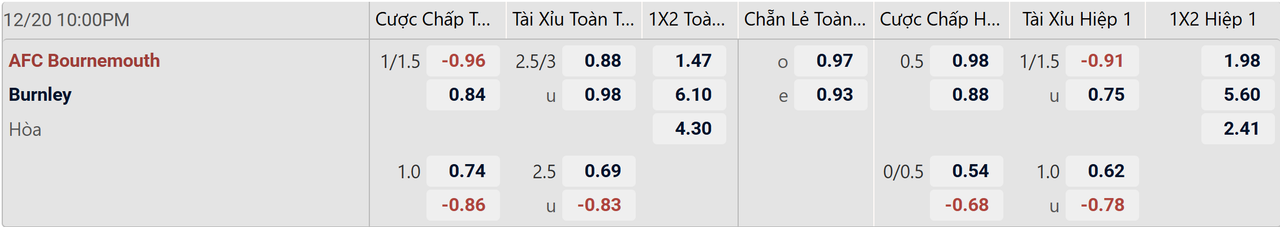 Trong lần gặp nhau gần nhất vào mùa giải 2023/24, Burnley thời điểm đó cũng đá trụ hạng, trong khi The Cherries sở hữu sức mạnh của câu lạc bộ tầm trung. Trải qua 2 màn đụng độ, chiến thắng luôn gọi tên thầy trò Andoni Iraola. Hiện tại cũng không quá khác biệt, Bournemouth tiếp tục sắm vai cửa trên chấp Rượu Vang Đỏ 1.25 FT. Nếu nhìn vào 7 màn trình diễn gần nhất không thắng của đội chủ sân Vitality, người chơi có lý do để ngập ngừng trong việc ủng hộ Bournemouth. Nhưng rõ ràng việc gia tăng tỷ lệ châu Á không phải do nhà cái đánh giá cao thầy trò Andoni Iraola mà là vì Burnley lúc này quá yếu. Căn cứ vào 7 thất bại liên tiếp của Burnley, Bournemouth tự nhiên trở thành phương án đầu tư sáng giá.