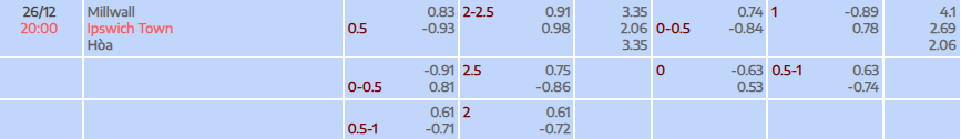 Tỷ lệ kèo Championship Millwall vs Ipswich Town