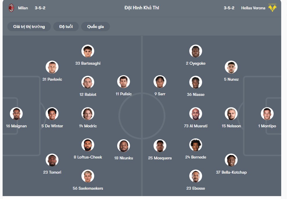 Xét về phong độ gần đây, hai đội đang thể hiện sự tương đồng nhất định. Trong 5 trận đấu gần nhất trên mọi đấu trường, cả AC Milan lẫn Verona đều giành được 2 chiến thắng, 1 trận hòa và phải nhận 2 thất bại. Tuy nhiên, nếu nhìn vào lịch sử đối đầu, có thể thấy Verona rõ ràng là đối thủ ưa thích của AC Milan. Rossoneri đang chiếm ưu thế áp đảo khi toàn thắng cả 9 lần chạm trán gần nhất giữa hai đội. Trong bối cảnh AC Milan đang cạnh tranh gắt gao cho vị trí dẫn đầu bảng xếp hạng, hoàn toàn có cơ sở để tin rằng đội chủ sân San Siro sẽ tiếp tục nối dài chuỗi thắng ấn tượng này và giành trọn 3 điểm sau khi 90 phút thi đấu khép lại.
