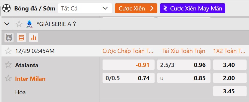 Tỷ lệ kèo Atalanta vs Inter Milan