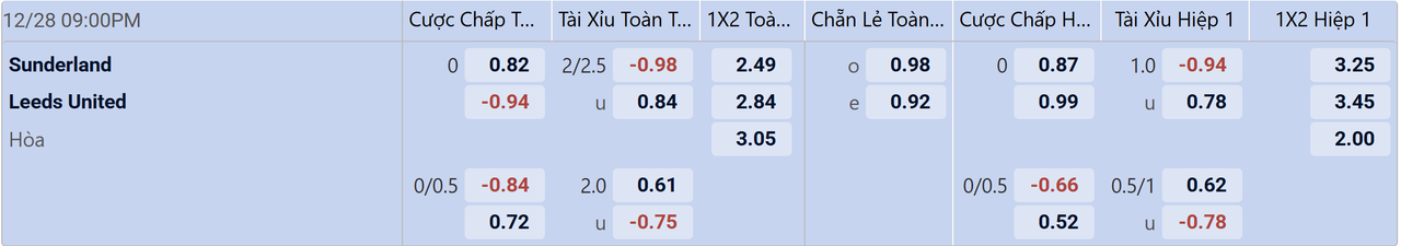 Khả năng về tài cũng trở nên sáng sủa khi tỉ lệ Tài xỉu chỉ là 2/2.5 trong khi 2/3 trận sân nhà mới nhất của Sunderland đã giúp người chơi theo tài giành chiến thắng. Bên cạnh đó, Leeds cũng cho thấy kịch bản tương tự khi có tối thiểu 4 bàn xuất hiện mỗi trận ở 4 trong 5 vòng đấu mới nhất trong khuôn khổ Ngoại hạng Anh.