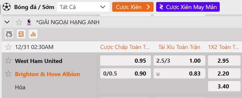 Xét về phong độ, West Ham trong 5 trận gần nhất hòa 2 và thua 3, ghi 4 bàn nhưng để lọt lưới tới 10 lần. Brighton có phần nhỉnh hơn với 1 chiến thắng, 2 trận hòa và 2 thất bại, ghi 6 bàn và thủng lưới 7 bàn. Lịch sử đối đầu 5 trận gần nhất cho thấy hai đội khá cân bằng khi mỗi bên đều có 1 chiến thắng và 3 trận hòa. Dù Brighton được đánh giá cao hơn nhưng phong độ sân khách không tốt gần đây cùng chuỗi 5 trận không thắng tại Ngoại hạng Anh khiến họ vẫn đối diện nhiều rủi ro. Trong khi đó, West Ham đang ở thế chân tường trong cuộc chiến trụ hạng và sẽ chiến đấu với quyết tâm rất cao. Chính vì vậy, kịch bản một trận hòa là kết quả được đánh giá khá hợp lý. Ngoài ra, với số bàn thắng trung bình trong các trận gần đây của hai đội cũng như lịch sử đối đầu, khả năng trận đấu kết thúc với dưới 3 bàn thắng là rất cao. Chọn cửa dưới của West Ham +1/4 trái và xỉu 2 3/4 trái cho kèo châu Á.