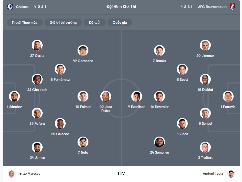 Ngay cả Stamford Bridge cũng không còn là điểm tựa vững chắc cho Chelsea ở mùa giải năm nay. Sau 9 trận sân nhà, họ chỉ giành được 14 điểm – thành tích chỉ xếp thứ 13 toàn giải. Đáng chú ý, Chelsea mới chỉ ghi được 13 bàn thắng trên sân nhà, con số còn thấp hơn cả số bàn họ ghi được trong các trận đấu sân khách (17 bàn). Điểm tích cực hiếm hoi lúc này là Chelsea sẽ được đối đầu với Bournemouth – đội bóng đang rơi vào khủng hoảng phong độ nghiêm trọng. Đoàn quân của HLV Andoni Iraola đang trải qua chuỗi 9 trận liên tiếp không biết đến mùi chiến thắng, trong đó có 4 trận hòa và 5 thất bại.