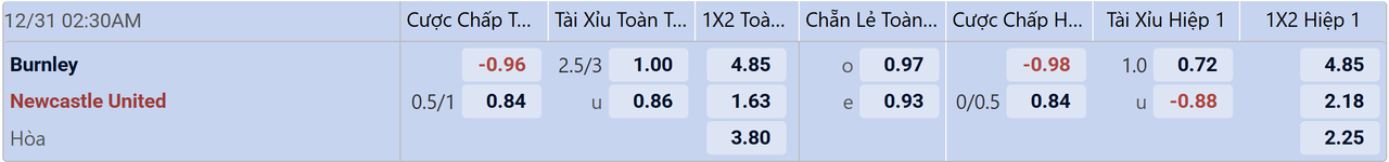 Đứng trước Newcastle, cơ hội thắng kèo châu Á của các cầu thủ Burnley được gia tăng đáng kể. Bởi lẽ, thầy trò Scott Parker được chấp 0.75 FT ở vòng 19, Ngoại Hạng Anh dù được ra sân tại tổ ấm. Nếu đứng theo góc nhìn của Chích Choè, khả năng vượt ải handicap của đội khách trên phương diện đội cửa trên rất thấp. Vì 8 chuyến du đấu gần nhất của Newcastle ở mọi đấu trường chỉ ghi nhận 2 lần ca khúc khải hoàn thành công. Dù sở hữu lịch sử đối đầu áp đảo trước Rượu Vang Đỏ, nhưng mọi kết quả trong quá khứ hiện giờ chỉ nên mang tính chất tham khảo vì thầy trò Scott Parker không còn sở hữu sức mạnh vượt trội.