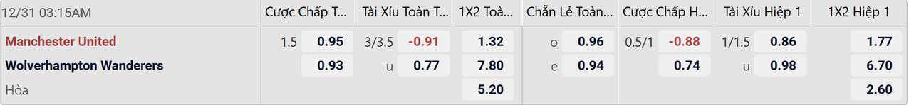 Man United đứng trước thời cơ khép lại năm 2025 bằng một chiến thắng vang dội trước Wolves ở vòng 19, Ngoại Hạng Anh. Với sự tiến bộ của Quỷ Đỏ và phong độ tuột dốc không phanh của Bầy Sói, hầu như đầu tư vào đối thủ của thầy trò Rob Edwards luôn luôn mang về lợi nhuận do thành tích chỉ hoà và thua kéo dài đến hiện tại. Bên cạnh đó, Man United còn sở hữu 3 thắng lợi liên tiếp trước Wolves khi sở hữu ưu thế sân bãi trong quá khứ. Do Bầy Sói yếu đến mức mới sở hữu 2 điểm ít ỏi, nên Man United có lần đầu chấp kèo trên 1 bàn tại Premier League 2025/26, cụ thể 1.5 FT. Tuy nhiên, nếu Quỷ Đỏ có trong tay đội hình mạnh nhất, họ mới là phương án đầu tư sáng giá trước giờ bóng lăn. Wolves có thể yếu nhưng khao khát chiến thắng của đội khách lớn hơn bao giờ hết. Không dễ để thắng cách biệt Bầy Sói dù biết rằng thầy trò Rob Edwards yếu nhất giải.