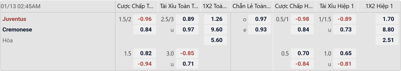 Tuy Cremonese vừa mới giúp người chơi đặt thắng cược ở vòng 19 với 4 lần nổ súng trong cuộc đón tiếp Cagliari. Nhưng đừng quên các vị khách từng có 4 trận ra sân trước đó không thể điền tên lên bảng tỷ số dù chỉ 1 bàn. Hơn nữa, Cremonese của quá khứ từng có nhiều lần tịt ngòi khi chạm trán Juventus, nên xỉu mới là phương án đầu tư an toàn trong kèo đấu 2.75 FT của nhà cái. Điển hình như cuộc đụng độ gần nhất của hai câu lạc bộ trên sân vận động Allianz, số lần rung lưới chỉ chạm mức 2.