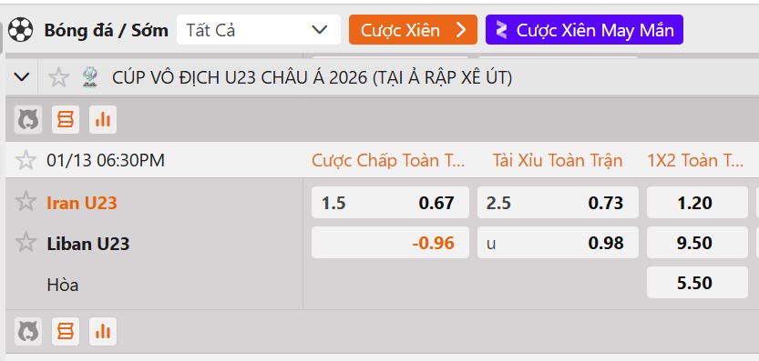 Tỷ lệ kèo U23 Iran vs U23 Lebanon