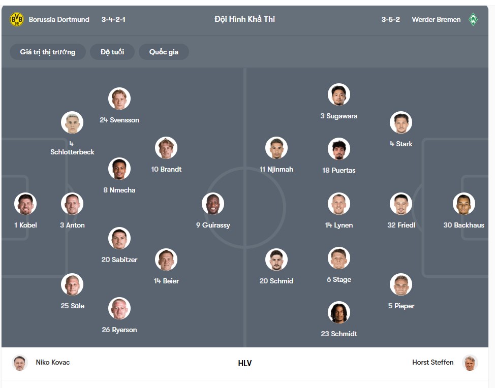 Phong độ tổng thể của Werder Bremen dưới thời HLV Horst Steffen đang ở mức báo động. Trong 5 trận đấu gần nhất, họ không giành nổi một chiến thắng nào, chỉ ghi được 3 bàn thắng và phải nhận tới 10 bàn thua. Đặc biệt, thành tích sân khách của Bremen là rất đáng lo ngại, khi họ chưa thắng trong 6 chuyến làm khách gần đây nhất, trong đó có tới 4 trận thua. Xét về lực lượng, Dortmund chỉ gặp tổn thất duy nhất ở vị trí trung vệ Aaron Anselmino, cầu thủ mới chỉ đá chính 4 trận tại Bundesliga mùa này. Trong khi đó, những trụ cột như Waldemar Anton, Emre Can và Nico Schlotterbeck đều đã sẵn sàng ra sân ngay từ đầu. Ở tuyến giữa, Marcel Sabitzer và Felix Nmecha nhiều khả năng sẽ được bố trí đá chính, dù Jobe Bellingham cũng là một phương án thay thế đáng cân nhắc. Trên hàng công, Serhou Guirassy gần như chắc chắn đảm nhiệm vai trò trung phong cắm, còn Karim Adeyemi và Julian Brandt có thể được sử dụng ở hai hành lang cánh.