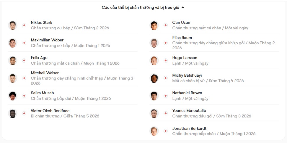 Phía Frankfurt cũng gặp những vấn đề nhất định về nhân sự. Tiền vệ Hugo Larsson đang gặp trục trặc về thể trạng và khả năng ra sân vẫn còn bỏ ngỏ. Tuy nhiên, nếu kịp bình phục, anh nhiều khả năng sẽ được xếp đá cặp cùng Oscar Hojlund ở khu vực trung tâm. Ngoài ra, việc hai tiền đạo Michy Batshuayi và Jonathan Burkardt liên tục vắng mặt trong những tuần gần đây đã ảnh hưởng không nhỏ tới sức mạnh tấn công của Frankfurt. Trong hoàn cảnh đó, Ansgar Knauff có thể sẽ phải đảm nhiệm vai trò tiền đạo cắm, dù đây không phải là vị trí sở trường của anh.