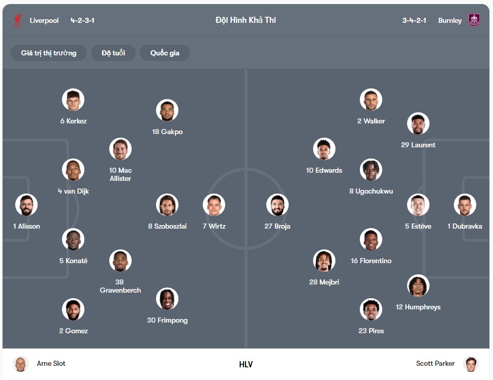 Về mặt lực lượng, Liverpool vẫn thiếu vắng một số trụ cột quan trọng như Mohamed Salah, Alexander Isak, Conor Bradley và Giovanni Leoni vì những lý do khác nhau. Dù vậy, HLV Arne Slot cũng đón nhận tin vui khi Hugo Ekitike đã sẵn sàng trở lại. Tiền đạo này tạo ra dấu ấn rõ rệt khi vào sân từ băng ghế dự bị ở FA Cup, ghi bàn và kiến tạo, mang đến thêm phương án tấn công đáng chú ý cho đội chủ sân Anfield. Trong khi đó, Burnley tiếp tục phải đối mặt với danh sách chấn thương dài hạn. Josh Cullen và Zeki Amdouni vẫn chưa thể trở lại vì chấn thương đầu gối, còn khả năng ra sân của Zian Flemming và Joe Worrall vẫn bỏ ngỏ. HLV Scott Parker nhiều khả năng sẽ tiếp tục sử dụng sơ đồ 3 hậu vệ với mục tiêu ưu tiên sự chắc chắn, dù điều này không hề dễ dàng khi phải làm khách trước Liverpool.