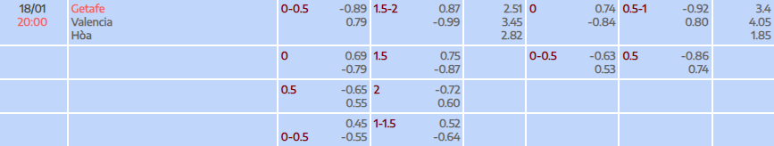 Phong độ trong giai đoạn vừa qua của Getafe là thực sự tệ khi mà đội bóng này không mang về trận thắng nào, còn lại là 1 trận hoà và 4 trận thua. Trong khi đó, Valencia đã thể hiện không thực sự ổn khi đội bóng này sở hữu 2 thắng lợi sau 5 trận đấu gần nhất trên mọi đấu trường, còn lại là việc họ có 2 trận hoà và đã phải nhận 1 thất bại. Trong 5 lần gần nhất đối đầu nhau giữa hai đội thì Valencia là đội thể hiện tốt hơn khi nắm giữ 3 thắng lợi, còn lại là 1 trận hoà và để thua 1 trận. Với tỷ lệ cược 0,25 trái thì người chơi nên tin tưởng vào Valencia ở cuộc đối đầu này để mang về cơ hội thắng kèo cao hơn.