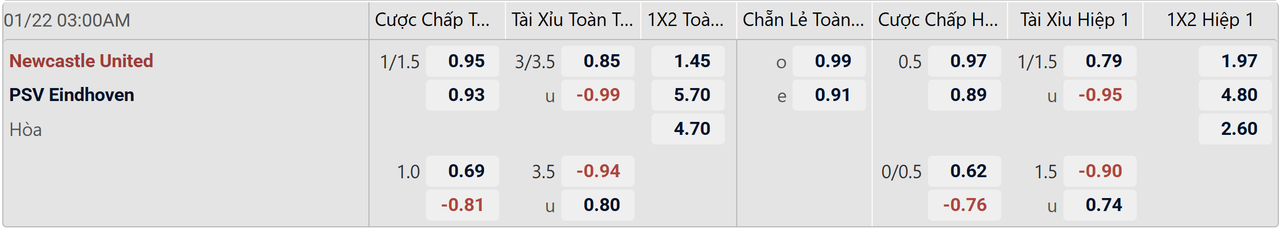 Nếu so về danh tiếng kèo chấp 1/1.5 FT nghiêng về phía Newcastle khá phù hợp nhưng thành tích hiện tại biến tỷ lệ trên trở thành con dao hai lưỡi dành cho Chích Choè. Đoàn quân của HLV Eddi Howe không hề thắng kèo châu Á trong cả 3 cuộc đụng độ gần nhất tại Ngoại Hạng Anh và 2 lần ra sân liên tiếp ở Champions League. Rõ ràng để đánh bại PSV đang thăng hoa với tỷ số cách biệt là một thách thức rất lớn của chủ sân Sport Direct Arena. Nên nhớ, PSV mới để thua 2/6 trận tại cúp C1 châu Âu và chỉ có 1 lần ra sân duy nhất khiến giới đầu tư thua lỗ với kết quả 1-3 trước Union SG. Ngay cả lịch sử đối đầu cũng đang ngầm ủng hộ đội bóng đến từ xứ hoa Tulip với 5 trận đọ sức với Newcastle từ trước đến nay và chỉ thua 1 lần duy nhất.