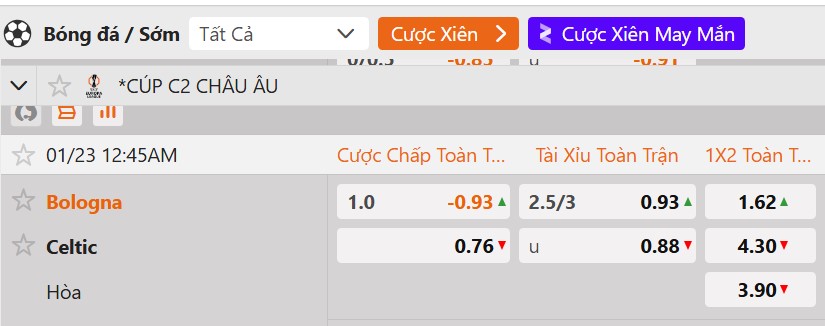 Tỷ lệ kèo Bologna vs Celtic